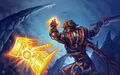 Tirion Fordring was originally a warrior of Lordaeron and was eventually knighted at the age of 18.[7] He eventually found faith and got closer to the Church of the Light, studying under the guidance of Archbishop Alonsus Faol. At the beginning of the Second War, he was chosen by the Archbishop as one of the four candidates from Lordaeron to start the order of the Knights of the Silver Hand, along with Uther, Saidan Dathrohan, Turalyon, and Gavinrad the Dire.[8] Faol presented each of the paladins with enchanted librams during their training that were among the church's most ancient relics. Each libram represented a core trait of the Silver Hand that Faol challenged his students to become the living embodiment of. Tirion was given the Libram of Retribution.[9] During his ceremony of induction into the order, Tirion received his hammer and from Saidan, who was one of his closest friends, the silver plates that he placed upon his shoulders, before being blessed and empowered by the holy powers of the clerics of the Brotherhood of Northshire and the Knights of the Silver Hand present.[7] Tirion battled in the final battle of the Blackrock Spire where he killed an ogre that was about to attack Alexandros Mograine.[10]